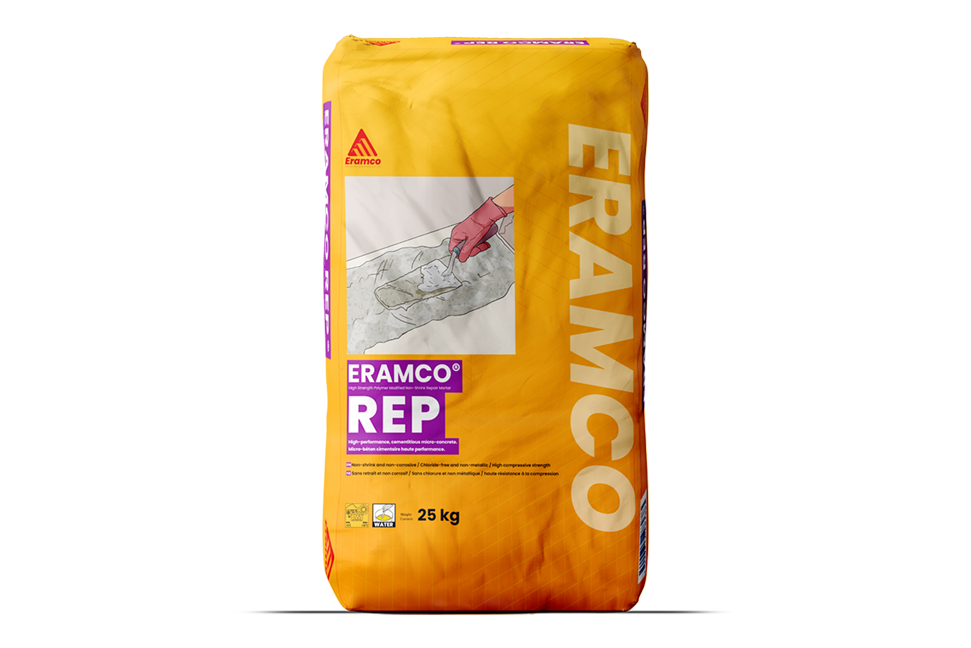 ERAMCO REP is a high-strength, non-shrink, single-component cementitious mortar designed for patching and repairing both vertical and horizontal surfaces of concrete and masonry.